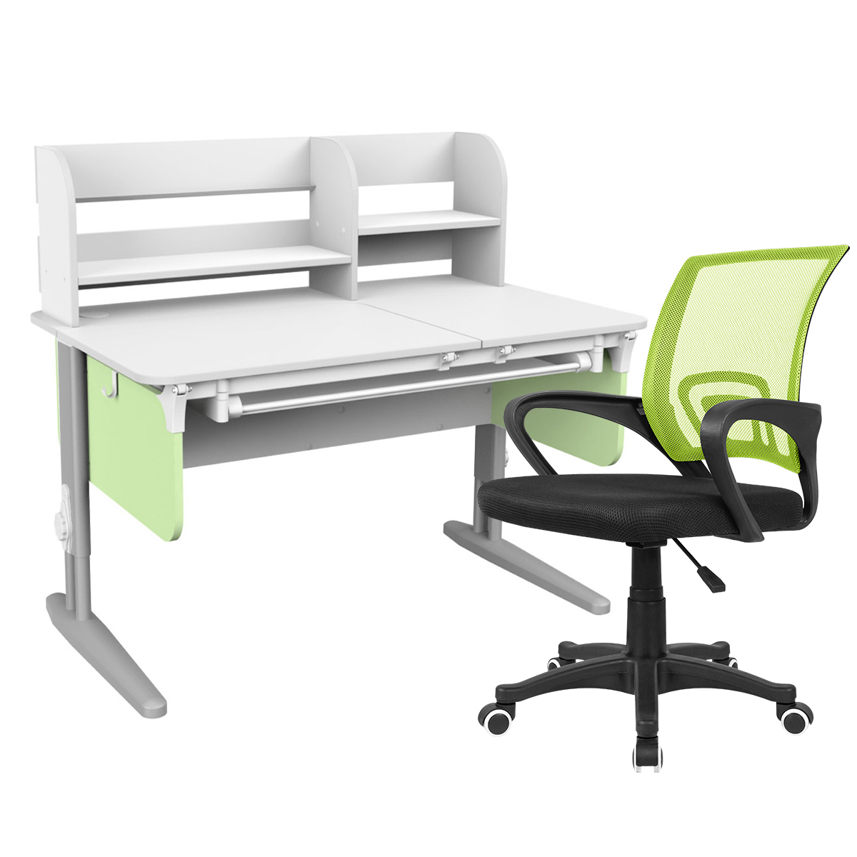 Комплект Дэми СУТ.62 PRO парта + кресло + надстройка + выдвижной ящик белый/фисташковый/серый с креслом Balance зеленый